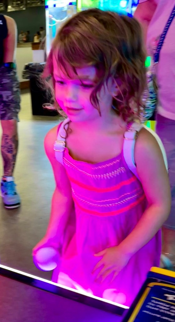 After a nice Family dinner Friday night, Saturday we were off to a combo Bowling Alley/Arcade/Restaurant. When we watched our three Grandkids playing games at the arcade, it was easy to think back to our three kids a long time ago playing pinball and the like at Nathan’s on Long Island, or on the Boardwalk in Ocean City, each with their handful of quarters. Of course, today you just use a swipe of a card to start the machines, but I think it was always fun to look at the quarters and know exactly how many you had left! All 4 kids (including 40 year old son Billy) gravitated to a modern version of Ski Ball, which they’ve all played along the Ocean City Boardwalk! Henry was very good, Annabelle not so much!