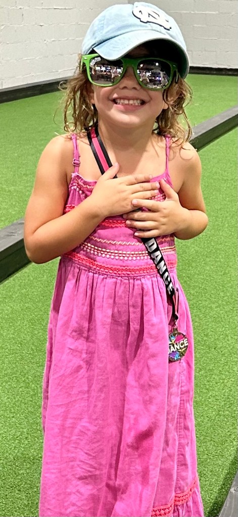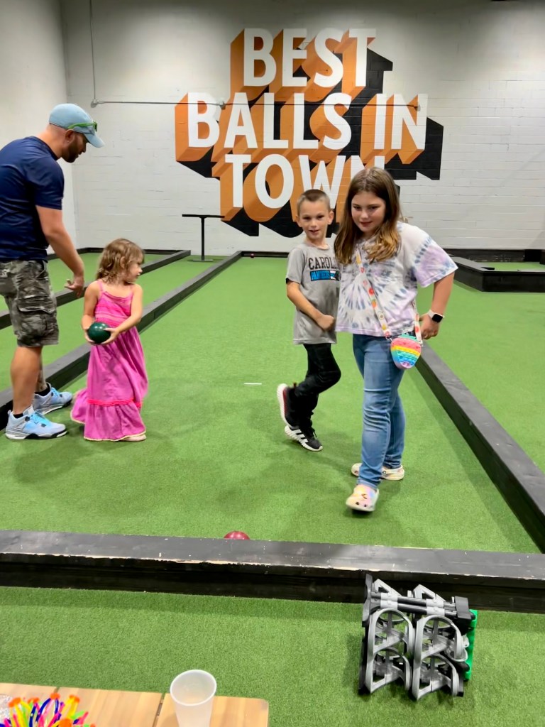 They wanted to go bowling, but all the alleys were taken, so Billy thought perhaps they’d like Bocce Ball. It took them a bit to understand the logic of throwing the little white ball, and then rolling the bigger balls at it, but eventually they got it…except for Annabelle who thought she should chase the little ball! Layla was very good at rolling her ball right next to the white ball, and was happy….till her Dad ran his ball into her’s and sent them all flying…that she didn’t like! After the arcade, Billy took us to Old Downtown Wake Forest, which we’d never seen before. The lunch spot was a place called Shorty’s Famous Hot Dogs, that just had it’s 106 birthday and is still run by the original family! I think the kids were a little taken back because it didn’t look like a McDonalds, but rather what a local food joint might have looked like back in the 50s when we were kids! The hot dogs and crinkle fries were good, but Susie, Layla and I discovered the cheeseburgers were even better (Layla enhanced here’s by putting the fries on the burger)!