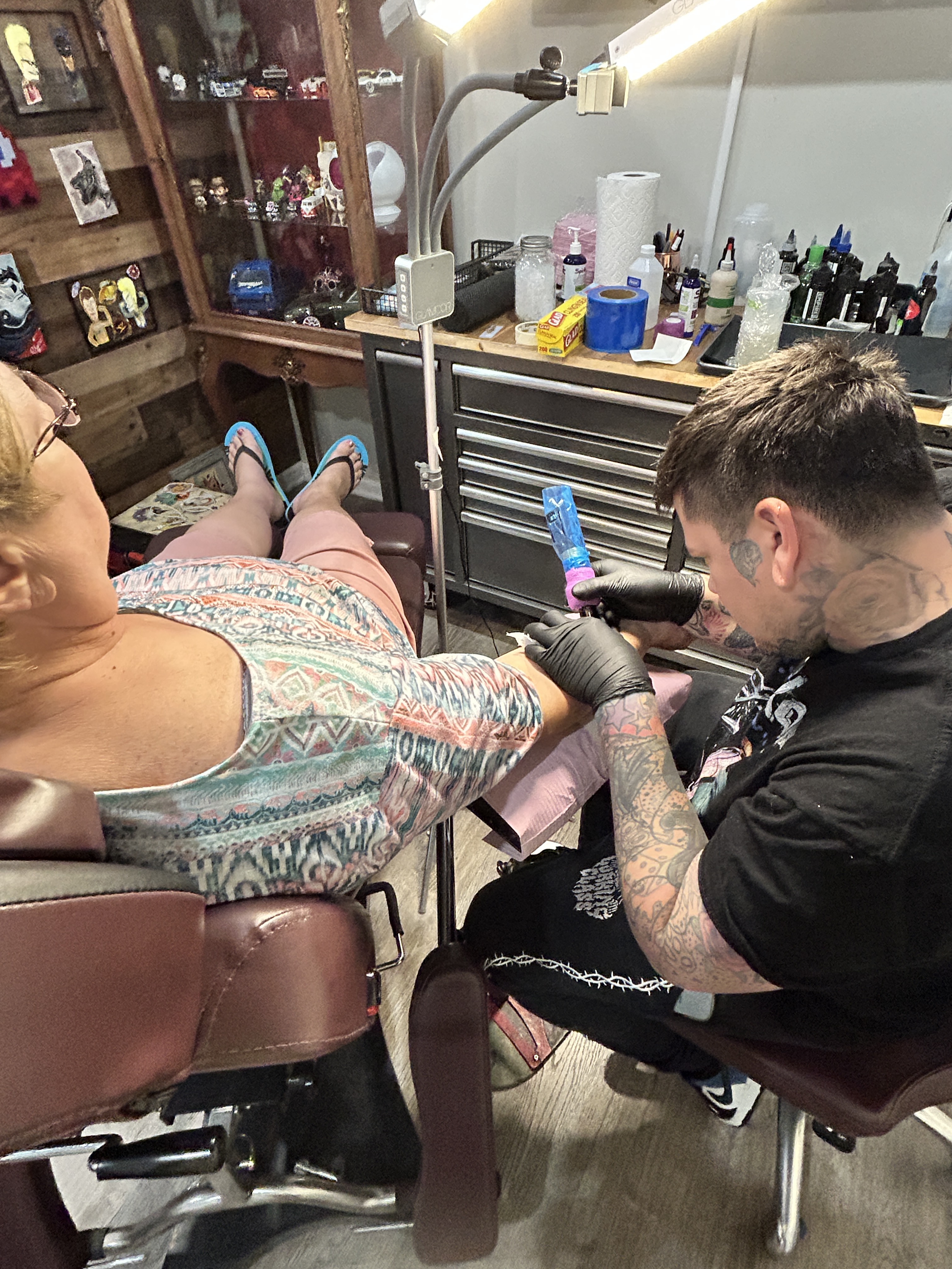 The whole place was very clean and Nes was super professional, and went the extra mile to make sure we were confortable. The actual process took very little time (Susie timed mine at 5 minutes) and in almost no time at all, we both had our first tattoos. Of course, we didn’t get a huge or extensive tattoo like our son Billy has, but I think I’d be safe to say that the anticipation was much worse than the actual act of getting the tattoo! So what did it feel like? Kind of like the “electric shock” you got when squeezing the handle on one of those “Test Your Strength” arcade machines back when I was a kid. More of a tickling vibration than pain. They are under a clear bandage right now, with it’s full debut scheduled for this Sunday!
