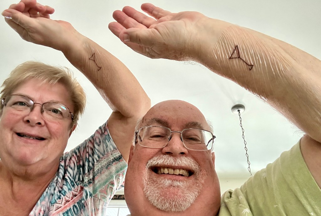 And just like that, Susie and I had our week back! Also, as you may note, it said that I’d satisfied my jury duty requirement for a period of 3 years. That means that the next time I might be called for Jury Duty was when I was 76 years old, and since Jury Service in New Jersey is optional after 75, I’ve in essence served my first and only Jury Duty in Cape May County. Now, we’ve just got to hope Susie dodges the bullet! So what, you may ask, did we do with our suddenly free week? Well among other things (grocery shopping, a trip to Walmart, pedicures, for both of us) , at the age of 71 and 73, Mrs. D’Elia and I got our first tattoos!