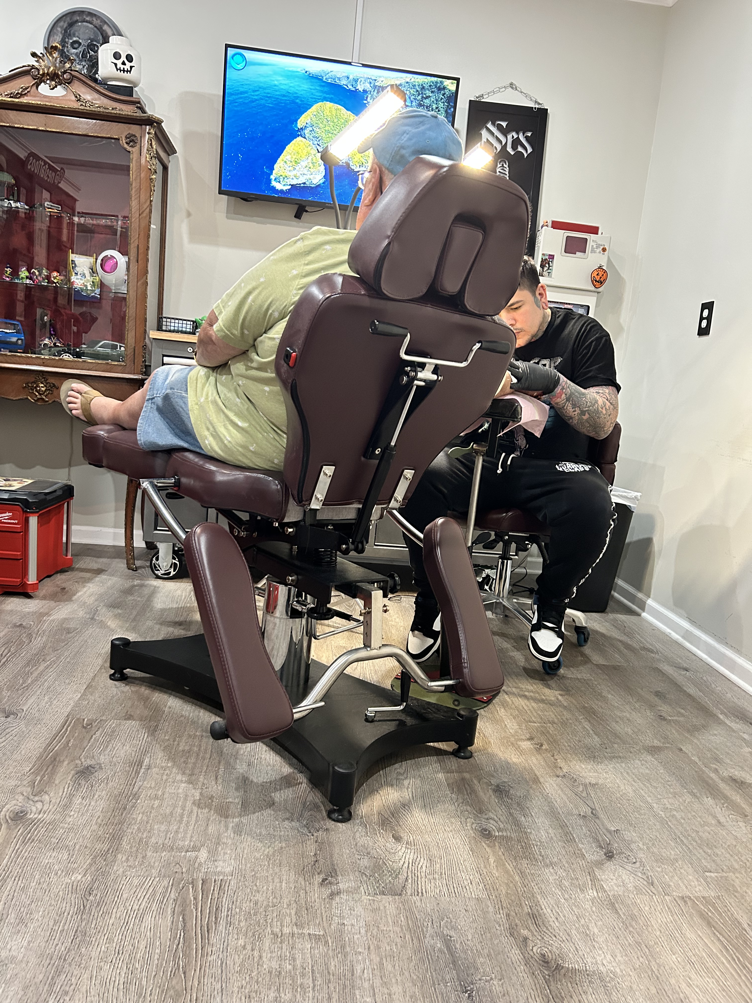 We met with Nes, one of their Tattoo Artists, explained what we had in mind, showed him the designs we liked, he told us what to expect, and then he said, “Well, we can do it right now, if you’d like.” Susie and I looked at each other, nodded, and said, “Sure. Let’s do it!” Nes then gave us some paperwork to fill out while he worked up our design. When we approved the design, he reproduced it in three sizes so we could figure out exactly what we wanted the finished project to look like. Then it was time to get into the studio, with Susie going first and me tagging along.